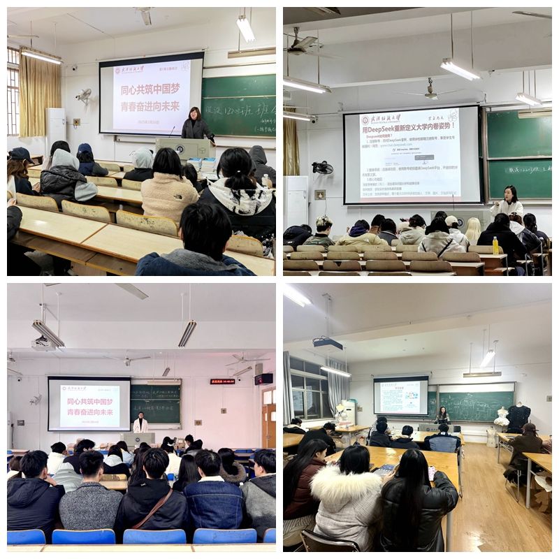 2025年是我国全面完成“十四五”规划的关键年,也是湖北省推进高质量发展的攻坚年。班会上,辅导员和班主任们特别强调“2025年湖北头等大事”——聚焦科技创新与产业升级,为区域经济发展贡献高校智慧。 对于纺大而言,新一年将围绕“跻身湖北省属高校第一方阵”目标,深化教育教学改革,强化产学研融合。辅导员和班主任们号召同学们以“踔厉奋发勇担当,笃行致远向未来”的精神,抓住时代机遇,在专业领域实现新突破。班会上,同学们纷纷表示,要把握时代发展机遇,努力学习,将个人梦想与国家发展相结合,以青春之我、奋斗之我,为实现民族复兴铺路架桥,为保障人民幸福添砖加瓦。