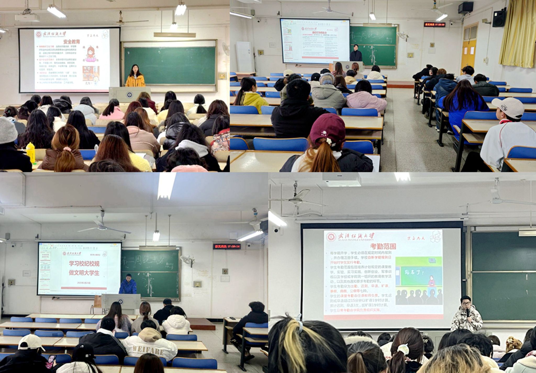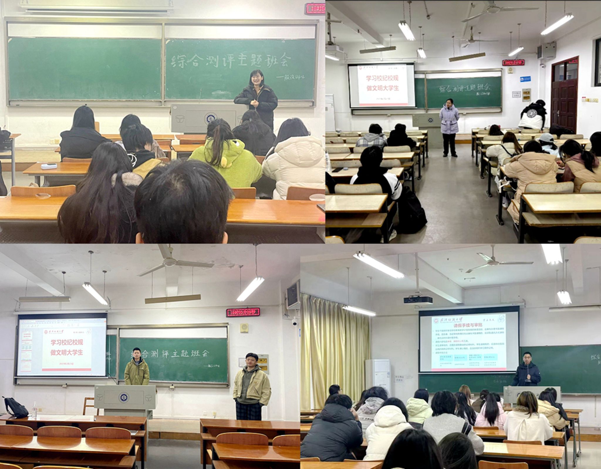 本科生考勤及请假管理办法》,强调班委要起好带头示范作用,积极向班级同学宣传班会相关精神,加强对校规校级的学习与贯彻落实。此外,大家还一同学习了涉嫌违纪的相关行为及受处分后的申诉处理办法,包括学术不端、考试舞弊、危害信息安全、违反宿舍管理及传染病防治规定等。