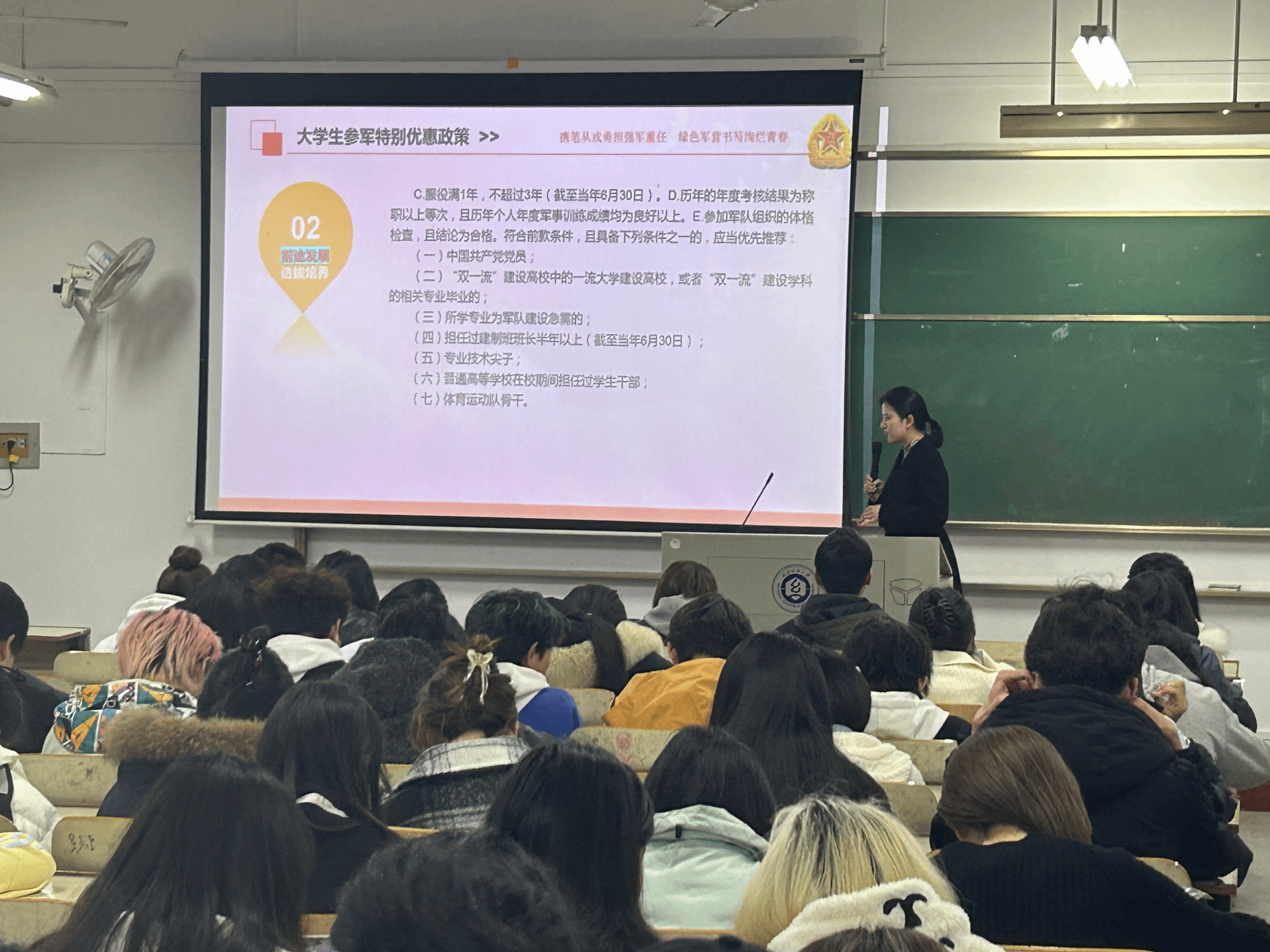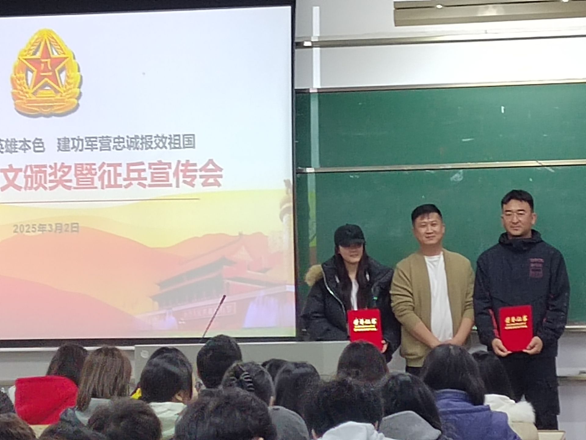 活动以“弘扬军旅精神,厚植家国情怀”为主线,分为政策宣讲、征文表彰与动员讲话三个环节。退役士兵熊蔓结合自身参军经历,向在场师生详细解读了秋季征兵政策,分享了军营生活的成长感悟,并号召青年学子“以青春热血投身强军事业”。