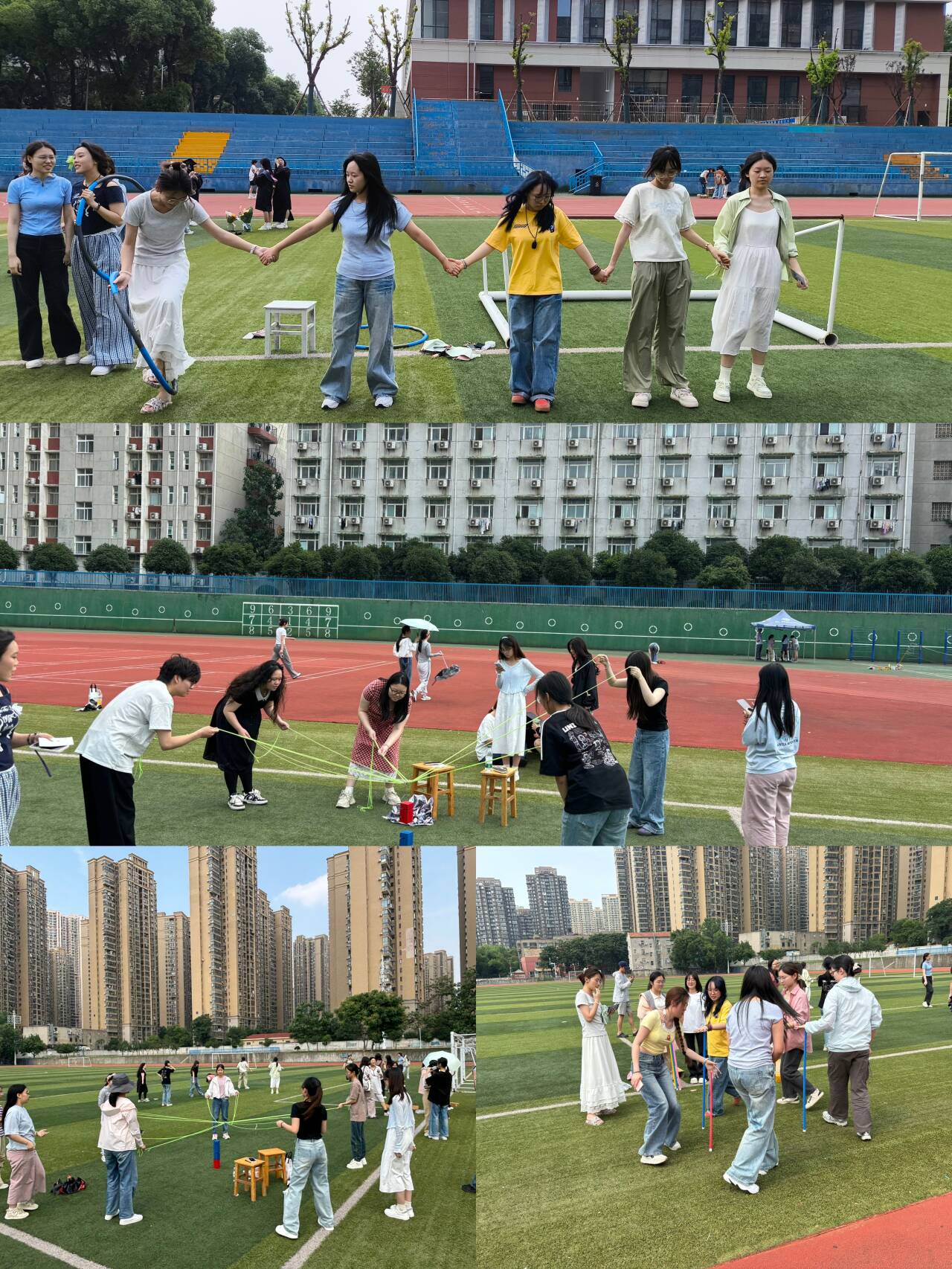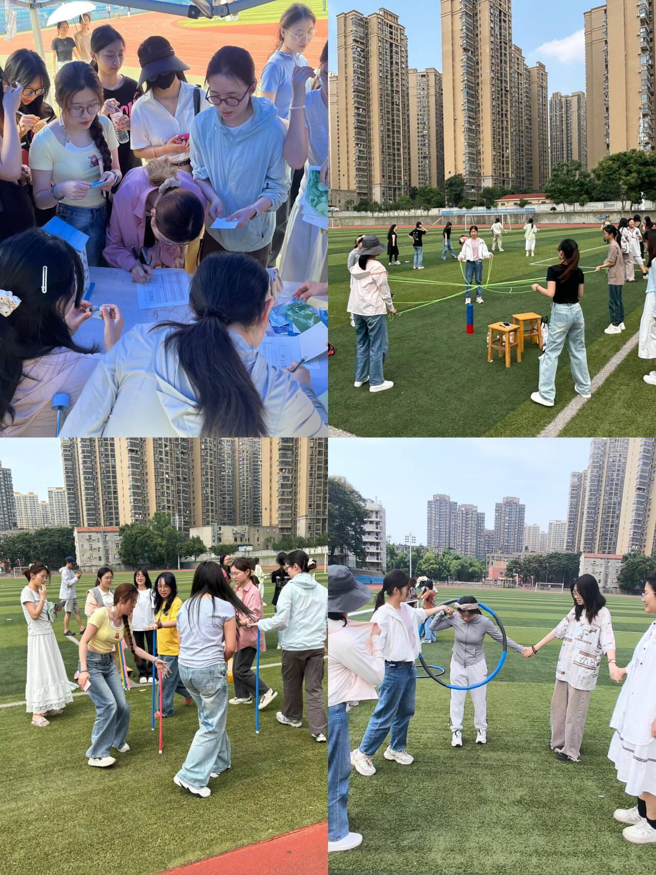 多人互动环节设计别出心裁:“画画接龙”要求6人一组接力完成主题绘画,用色彩传递积极心态;“传呼啦圈”和“不倒森林”考验团队默契,参与者手拉手传递呼啦圈或协作支撑长杆,笑声中拉近心灵距离;“合力建塔”与“球球夹夹乐”则需成员分工配合,在限时任务中感受信任与支持的重要性。心理指导老师高梓超全程参与指导,她表示:“游戏不仅是放松,更是人际关系的‘润滑剂’,让学生在互动中学会沟通与共情。”