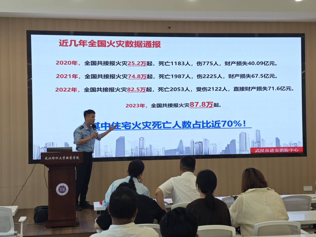 在特邀武汉市进安消防中心资深教员尹亮在学院211会议室为全院教师举办了一场主题为“人人讲安全、个个会应急——查找身边安全隐患”的专题消防培训。培训会由学院党委书记杜新年主持,学院全体教师参加。