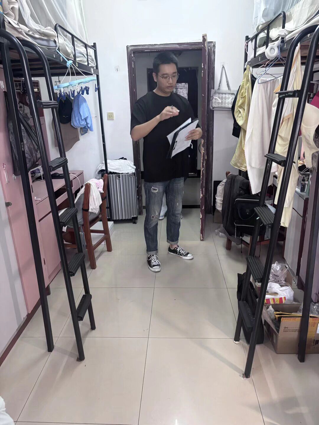 在检查过程中,各年级表现良好,积极配合。本科和研究生25级、24级宿舍表现尤为突出,多数宿舍地面干净无杂物,被褥叠放整齐,生活用品摆放井然有序,部分宿舍还通过绿植、励志标语、手工作品等装饰营造出温馨奋进的文化氛围,涌现出多个优秀寝室,获得检查小组一致认可。高年级宿舍亦可圈可点,整体卫生与秩序保持良好,文化氛围浓厚。但也发现少量宿舍存在问题,个别寝室烟头散落、违规饲养宠物、垃圾乱扔等现象,检查人员已当场明确整改要求与时限,后续将由辅导员跟进整改落实。