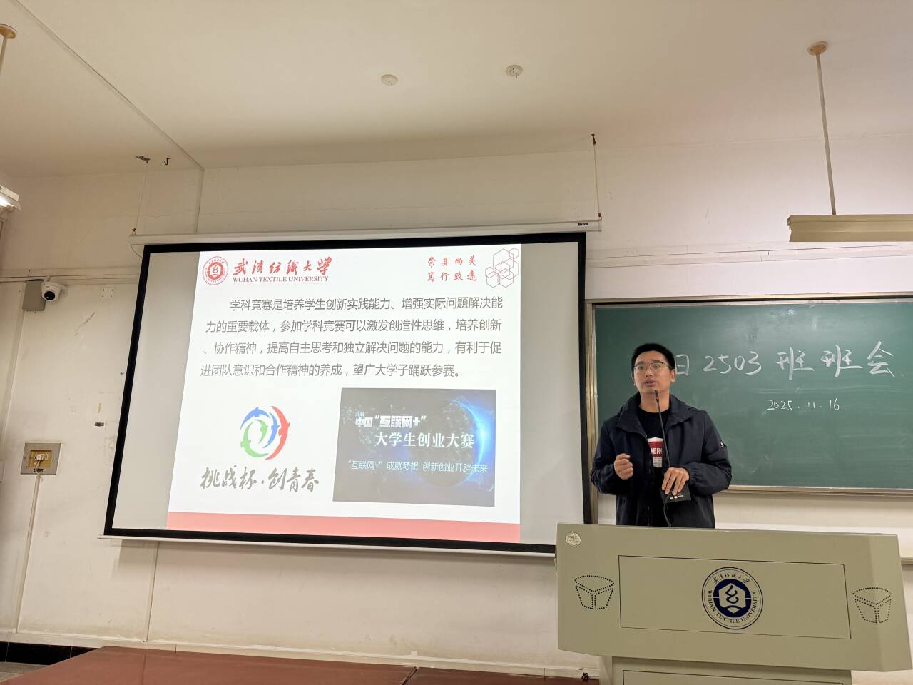 辅导员、各班主任带领学生深入学习总书记对青年科技人才的重要寄语,通过视频展播、成果海报等形式,重点呈现我校在“挑战杯”全国总决赛中的优异战绩,生动讲述参赛团队跨界创新、攻坚克难的奋斗故事。“青年最具创新热情,服装专业也能在科创赛道发光”,辅导员及各班主任结合专业特色鼓励学生,将传统服饰工艺与现代科技结合,在创新实践中锤炼本领,树立科技报国志向。