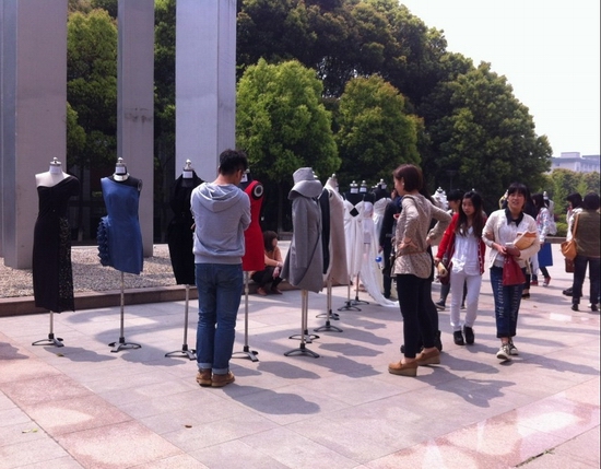 服装设计专业大三学生的“立裁(二)学习历程”成衣设计作品展在南湖校区综合楼前的广场上如期举行。