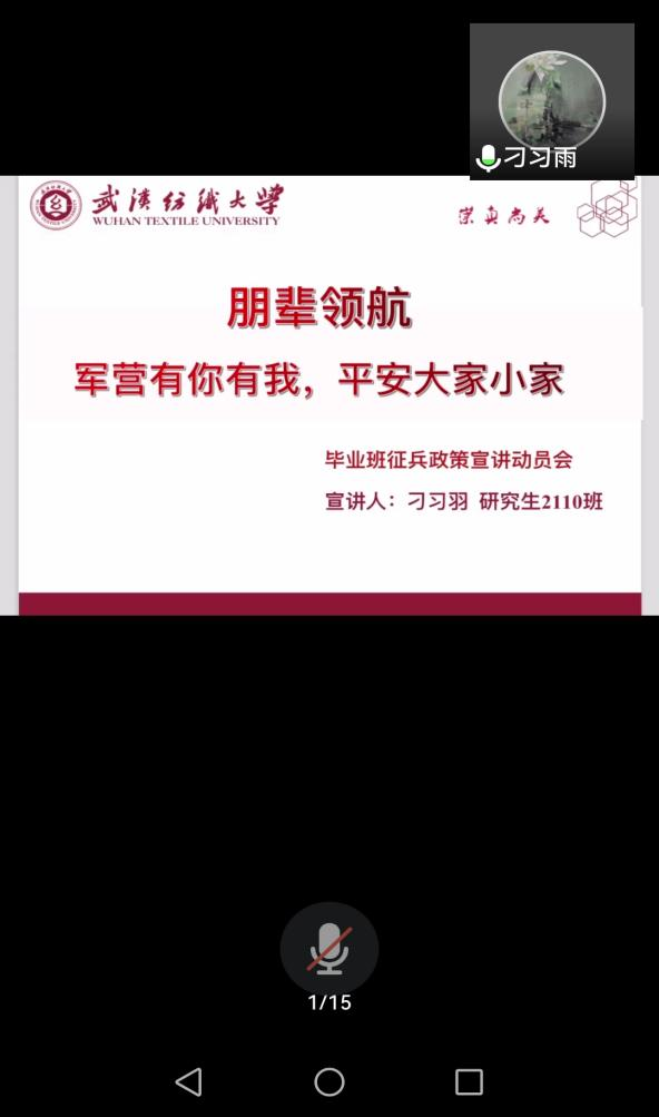 于5月16日通过朋辈领航的形式,对2021届毕业生进行了专场参军入伍宣讲会。鉴于许多毕业生受疫情影响未能返校,宣讲会采取线上方式进行。服装设计21级研究生刁习羽同学作为优秀退役士兵代表,受邀宣讲。