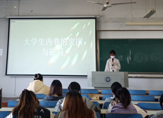 心理工作站指导老师罗周燕提出,因为目前竞争压力过大,导致内卷状况在大学校园盛行,进而对大学生心理健康造成一定影响。她从典型的大学生心理咨询案例出发,分析“内卷”现象对大学生心理健康产生的不良影响,并分析了其形成的社会、学校、家庭、个人四重因素,引导在座各位干部学会从学校、家庭、个人三个层面采取相关应对措施,避免让“内卷”成为“内耗”,罗老师鼓励同学们:逃离内卷是现在压力竞争之下一定要做的事,它并不是让人消极怠工,而是逃离社会的无敌漩涡,抽离出来,找到自我,为自己真正想要的东西努力。她寄语同学们能在大学四年里活出自我,走出内卷的困境,看见远方的美好,找到生活的意义。