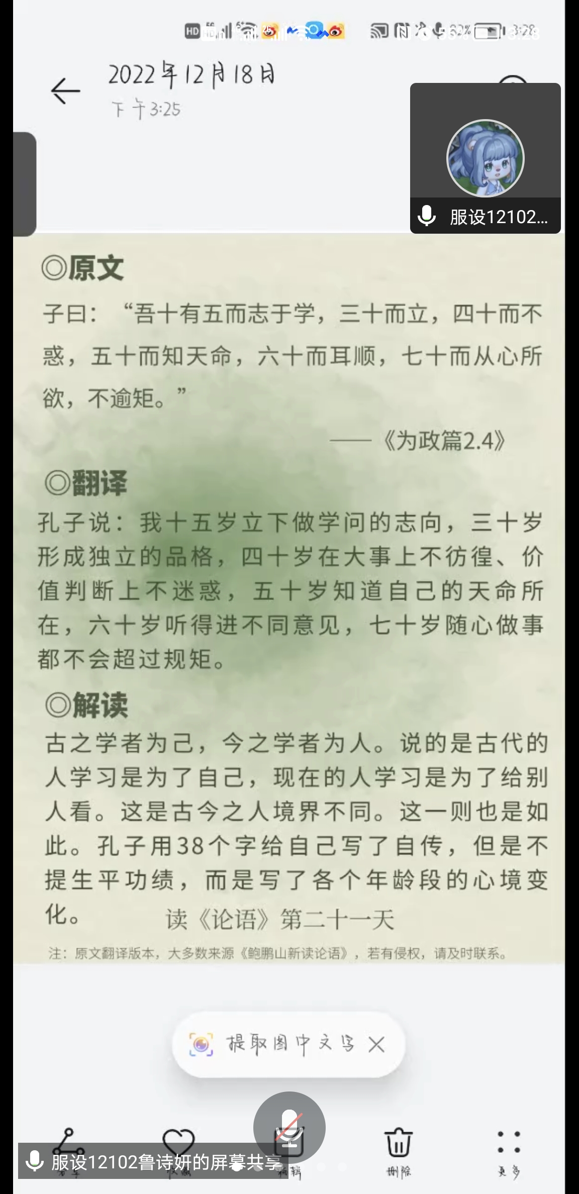 当代著名学者、中国孔子研究院院长杨朝明曾在央视《开讲啦》这样说道:“如果把中华文明比喻成一棵大树,这棵大树的主干就是儒家文化,大树的根部则是孔子,以及包括孔子在内的先哲们。大树树干之所以粗壮,就是因为大树的根扎得深扎得牢。”为让服装学子们学习和了解儒家文化了解中华文化,12月18日15:00,我院“声色纺大”诵读协会在线上组织30多位同学,开展了线上《论语》学习交流活动,这也是学院“阅享经典·品味人生”读书节子活动之一。