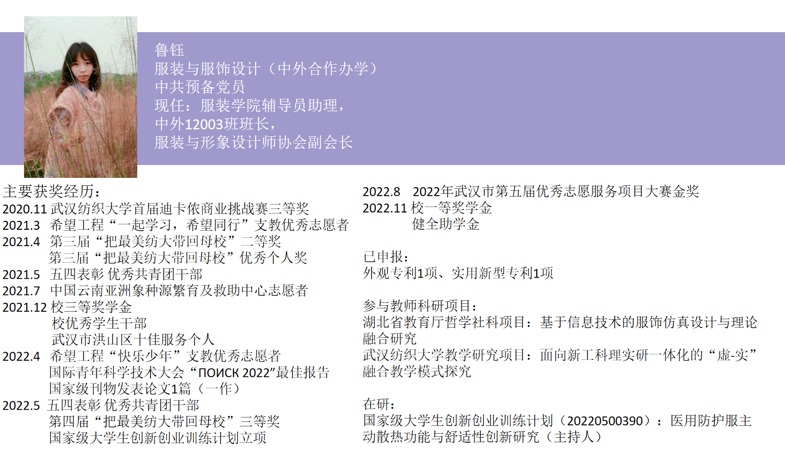 的鲁钰同学,她曾两次参加“把最美纺大带回母校”的社会实践活动并成功参加答辩,拥有着丰富的经验,她在分享中以梳理整个活动过程为主。在会上鲁钰同学以了解活动、立项与策划、执行与记录、总结与汇报四个方面展开,重点讲述了开展活动前期需要做哪些准备,活动过程中可能遇见的问题以及撰写结项报告的技巧。她以丰富的实例为大家开展多样化活动提供了参考,给予了大家很大的启发。最后鲁钰同学以自己的答辩PPT节选以及答辩稿为例,给大家讲解了结项与展示的重点所在,为同学们之后开展活动提供了参考模板。