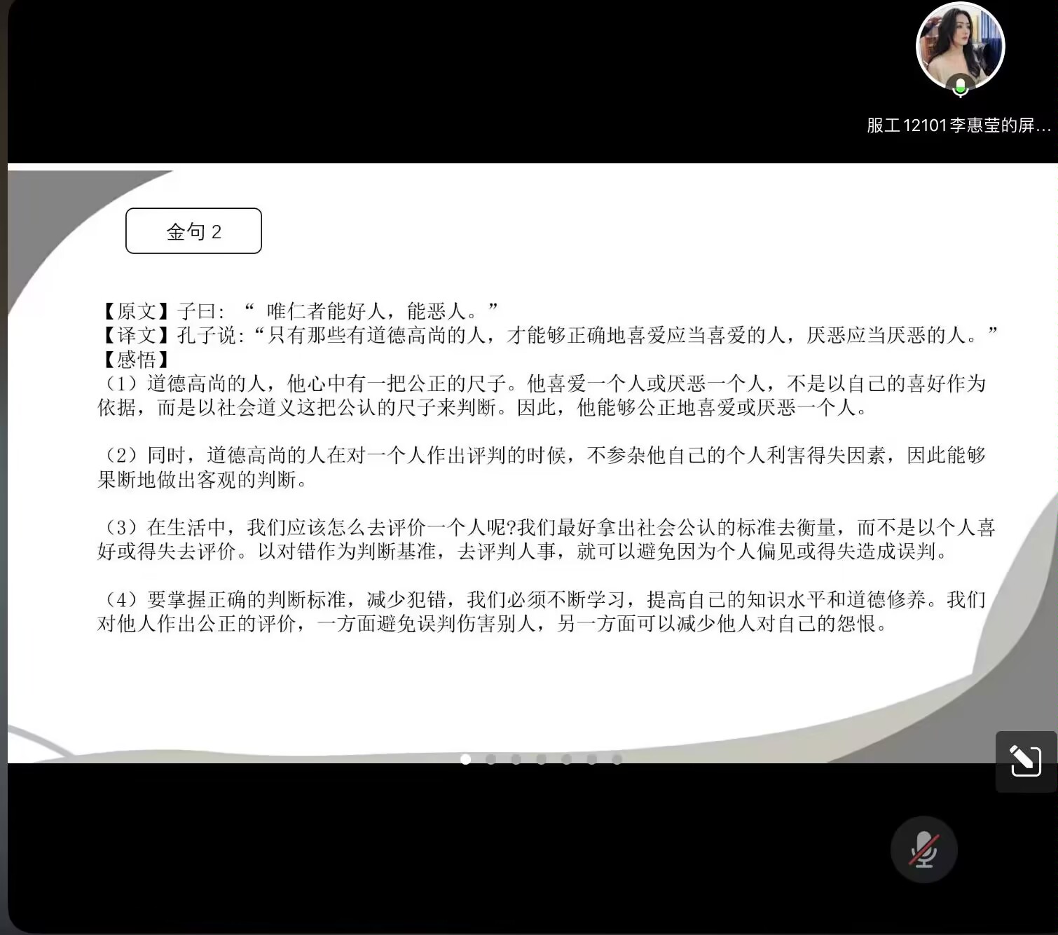 第四组的四位同学着手卫灵公篇和为政篇中的金句,讲述谋道,"道不同,不相为谋""君子谋道不谋食"字字千金,其文约,其词微,其志洁,其行廉,似乎历历在目,儒家之大道,其文小而其指极大,多方位地总结讲解评价内容。