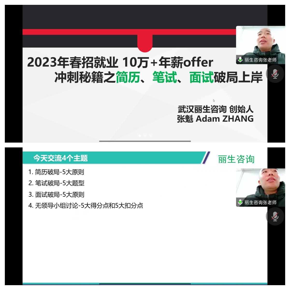 “考研后,赋能加油站”活动第三场,武汉丽生咨询创始人张魁老师以“如何冲刺2023年春招就业”为主题,给同学门详细讲解了如何撰写优秀简历,以及笔试、面试和无领导小组讨论技巧。