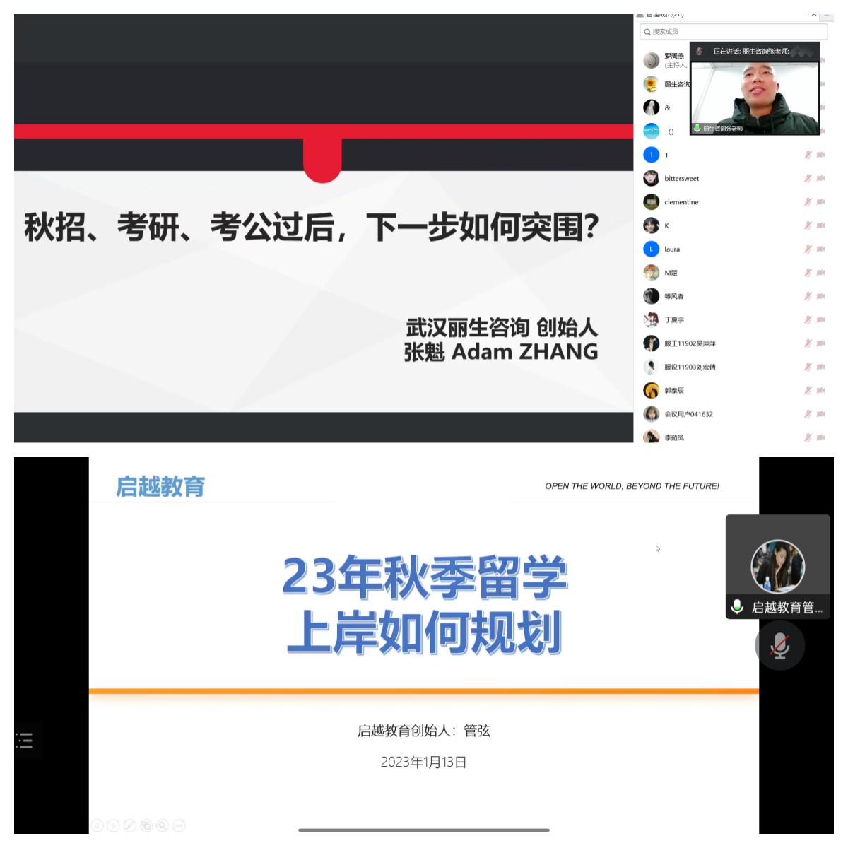 “考研后,赋能加油站”活动拉开序幕。活动第一场,武汉丽生咨询创始人、原新东方教育科技集团高管张魁老师以“秋招、考研、考公过后,下一步如何突围?”为主题,向同学们讲解如何根据自己具体情况,对接下来是继续考研、考公、留学,还是就业或者创业等进行决策选择。启思越见教育创始人管弦老师以“23年秋季留学上岸规划”为主题,通过对比各留学国家和专业选择路径,向大家介绍了如何拿下国外学校2023年秋季录取上岸机会。