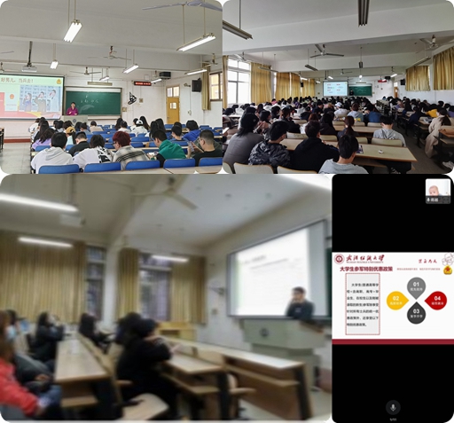 高度重视征兵宣传工作,继承办南湖校区的宣传活动后,各年级辅导员在4月9日通过主讲主题班会、组织班级讨论等方式对全体学生再次进行了参军入伍政策宣讲。