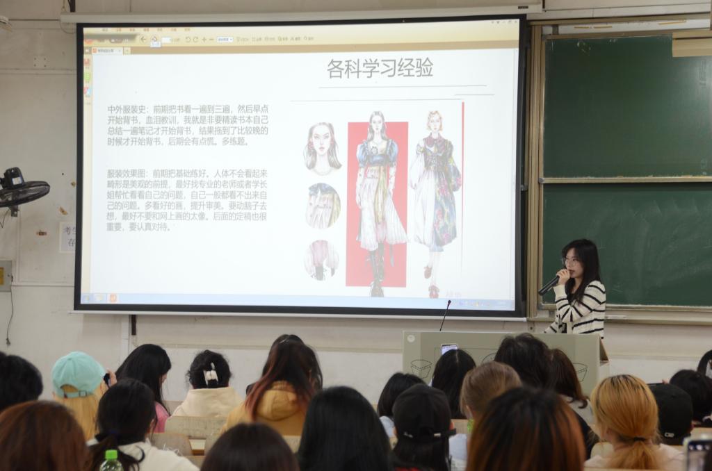 为了让大家明确考研目标,掌握相关考研经验,帮助下一届同学更好的复习备考,服装学院于2023年5月11日下午14点在尚知楼109教室举办了服设专业考研经验交流分享会。分享会上,5位成功“上岸”研究生的学姐——工业制版11901班朱翠云、服工11902班韩佳敏、服设(中外)11902班曹冰茨和针织11901班蒋礼香逐一作了备考经验的分享。学院有意向考研的100余名学生参加了本次分享会。