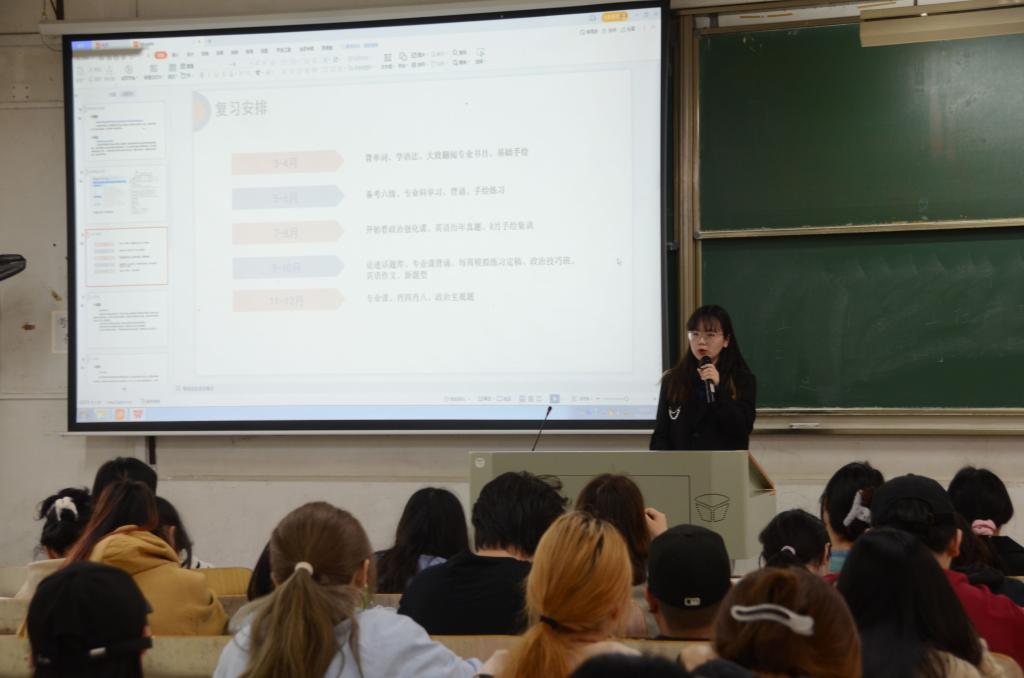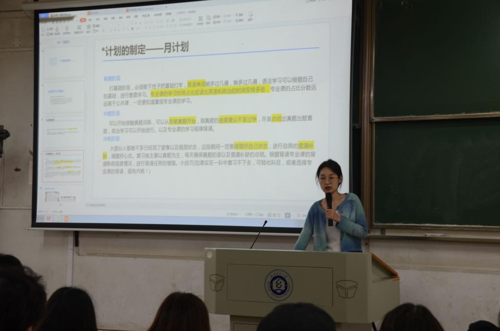 材服饰创新与设计专业硕士研究生。她以个人经历为例,向大家着重讲解了备考过程中作息时间如何安排以及各科的学习经验。她提醒大家,相比学习,身体健康更重要,而健康的作息时间效率更高。在学习过程中,大家要学会收集有用信息,缩小信息壁垒,同时要学会辨别,找到适合自己的学习方法。此外,我们平日也要虚心请教。“我们需要有一颗坚定的心,任何时间开始都不晚。“