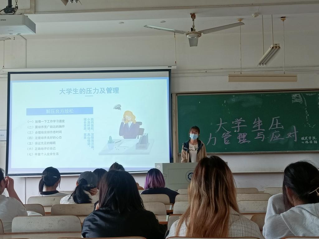 主讲人咨询部部长肖亦园首先通过几道心理压力测试题,让同学们了解自己目前的压力程度。通过具体案例,介绍了压力的生理信号、情绪信号、思想信号、行为信号等具体表现。接着从学业、人际、适应、突发事件以及就业发展等方面讲解了压力的来源。压力有积极作用,也有消极作业,我们要正确认识压力,并学会应用一些解压方法,学会自我调节。