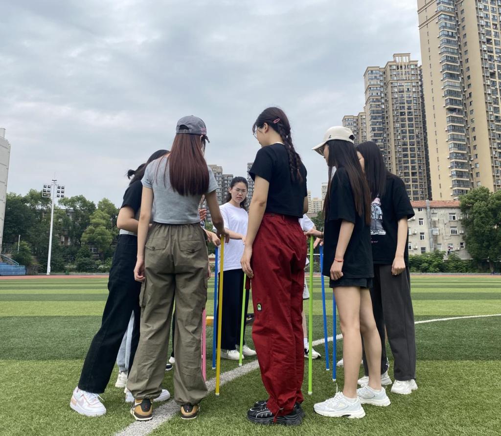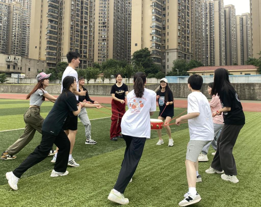 “同心击鼓”考验着团队成员间的默契与配合,为了掌握击球的力度,同学们不断调整力度,默契度也在游戏中不断增加,联系更加紧密。