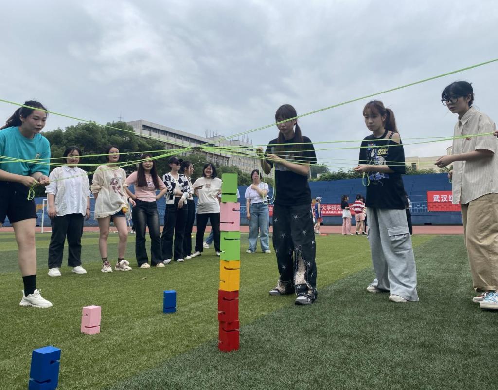 “合力搭塔”需要队员们合力操作手中的绳索将塔一块块垒起来,同学们小心翼翼地放置塔块,通力合作。