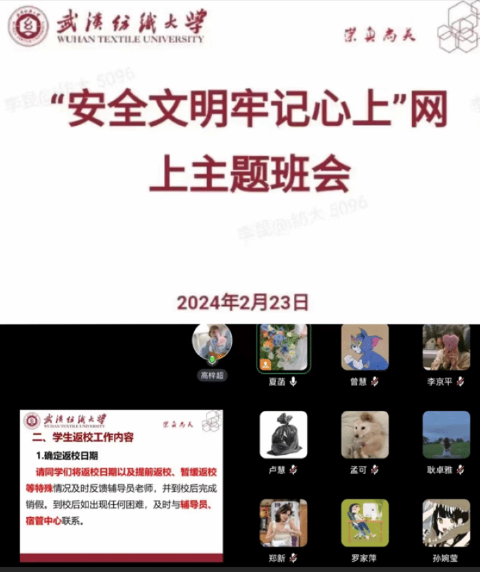 通过线上班会,进一步明确了返校学生名单,学院将在学生返校前后积极做好宿舍检查等各项开学准备工作,保证学生返校后正常学习生活。