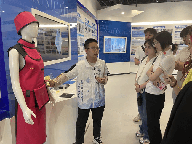 在现场讲解员的带领下,全体同学通过观看视频、查看实物、了解每一个科技成果背后的故事,深刻感受到我国科技自立自强对于中华民族伟大复兴的重要意义。同时,通过专业纺织面料的认识,不仅提高了同学们对于专业探索的进一步兴趣,更是感受到我校纺织科技发展的巨大飞跃。同学们纷纷表示,通过对中国纺织的历史以及优秀校友的了解,以及观看了各国纺织品出口数量的动态视频,感受到中国纺织品出口数量迎来了巨大地飞跃,看着中国排名从落后到世界第一,同学们深感自豪。在讲解到纺织面料的时候,同学们深刻了解了并学习到专业纺织面料的技术知识,大家对先进的纺织科研技术报以极大地学习兴趣和好奇。每当讲解员讲到一个新的发明专利或是拿出新型材料时,同学们皆是发出赞叹便纷纷上手触摸,无不感叹研究人员的智慧及才华。例如超高分子量聚乙烯纤维这种神奇的材料,就是超高密度的塑料材料,讲解员让同学们上手拉扯,同学们没有一个扯得断的,大家纷纷感到神奇,后得知此材料用于军事领域,同学们都为学校的科研工作者竖起了大拇指。