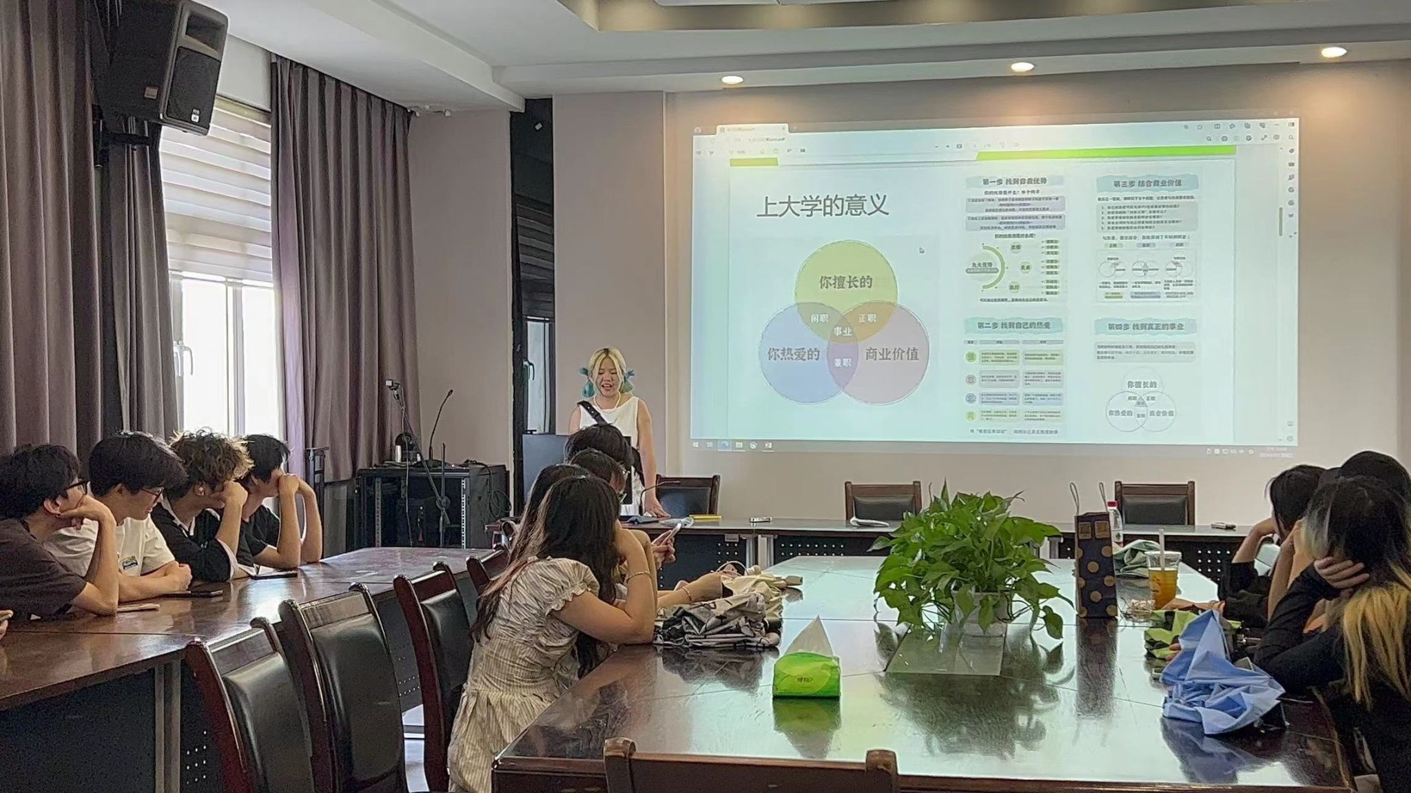 苏凌云同学作为第二位分享者以自己的创业经历为例,为在场的同学们呈现了一个充满激情与梦想的青春故事。苏同学在大学期间就积极参与各类创新活动,大学期间更是毅然决然地选择了创业道路,她分享了自己在创业过程中的酸甜苦辣,以及如何克服困难、迎接挑战的心路历程。苏凌云的分享不仅激发了在场同学们的创业热情,也为他们提供了宝贵的创业经验和启示。她还讲述了实习、就业的经历,鼓励同学们积极行动,不断提升自己的综合能力,丰富多彩的大学生活,也引得同学们对未来充满了期待与憧憬。