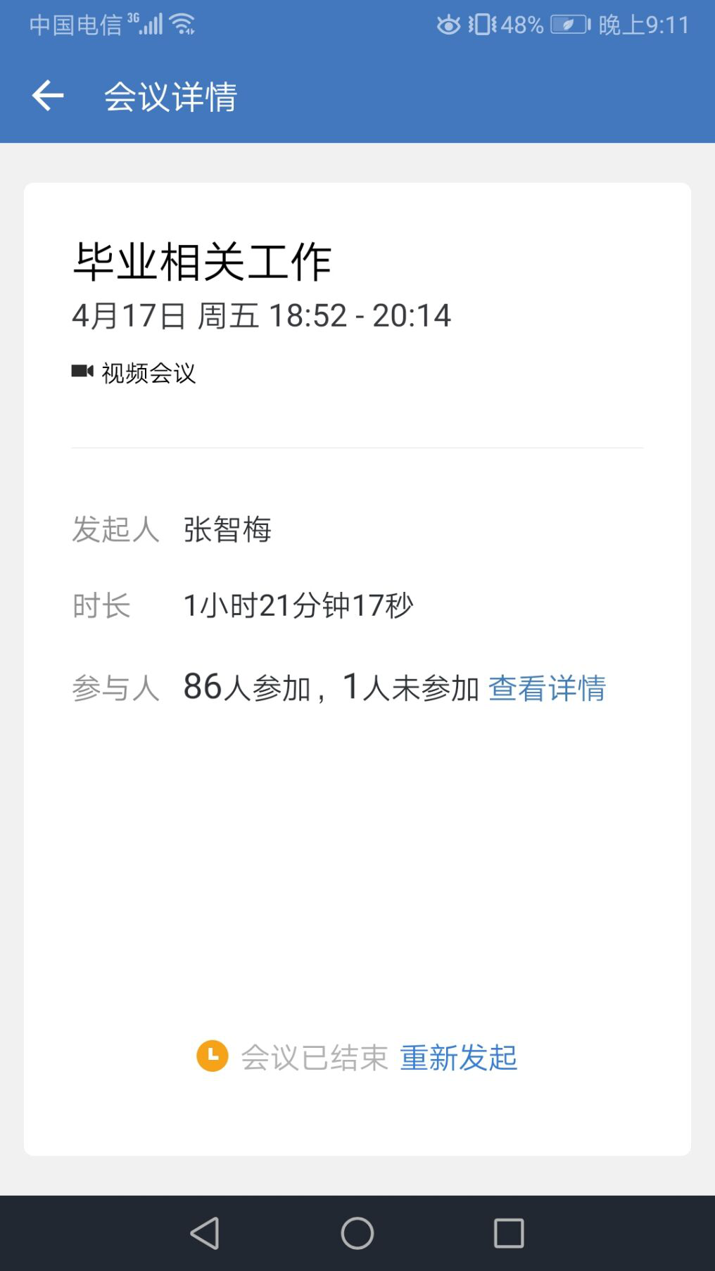 近期在线召开了毕业年级工作会议。学院毕业班辅导员张老师首先通过企业微信召开全年级班委成员大会。会议围绕本学期已经开展的工作和后续的工作进行了交流。