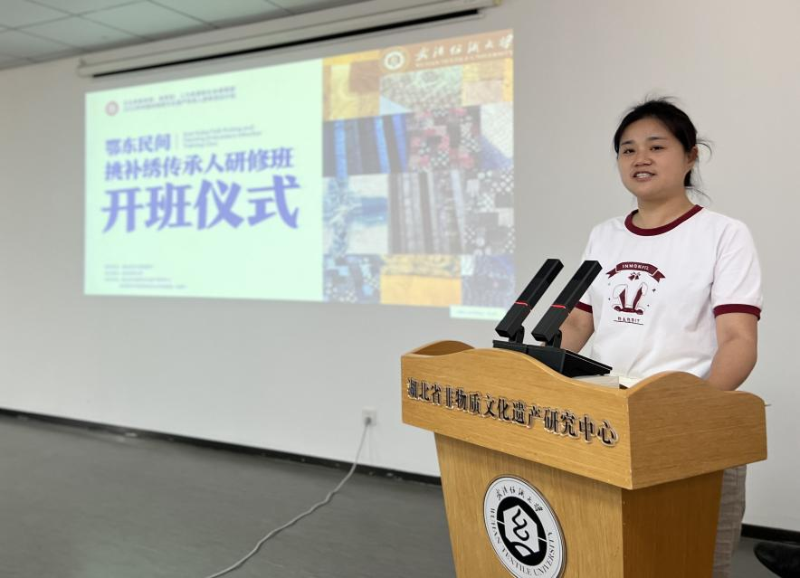 黄梅挑花市级传承人洪利作为学员代表发言,她讲述自己作为民间挑花传承人中的“新人”,过去在参加传承人研培学习中就收获颇丰,这次的课程安排中不仅有高层次的师资力量,教学形式与研学内容丰富独特,在与授课老师、学员交流学习的过程中,可以拓宽思路、明确方向,同时也深感非遗保护工作的重要,因此十分珍惜难得的学习机会。