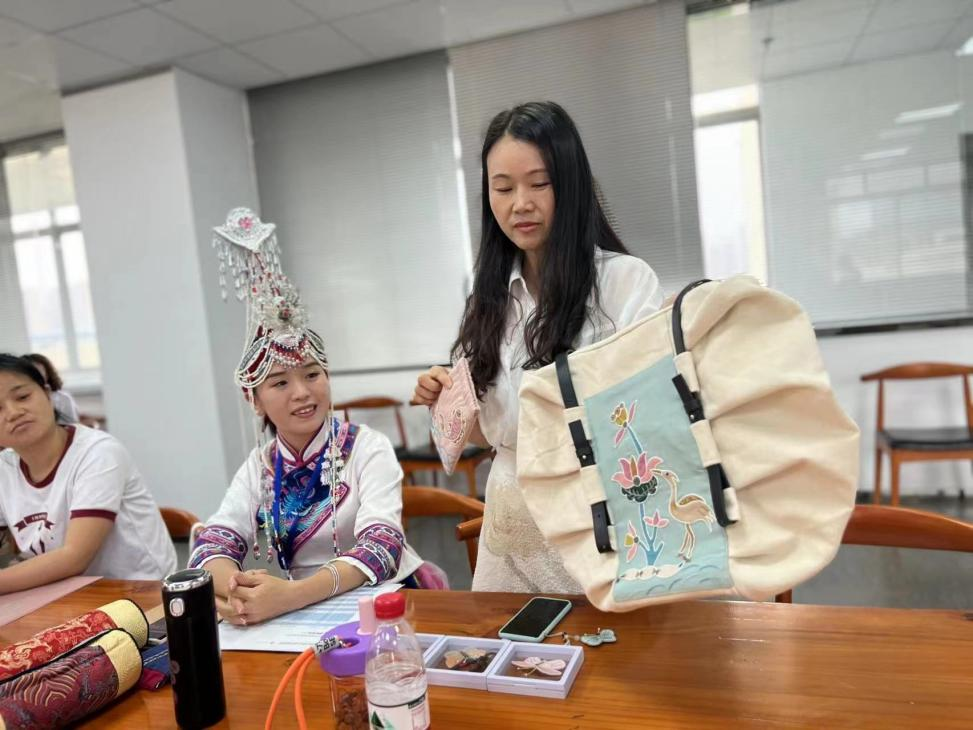张旎副教授作为教师代表发言。她讲到,将传统技艺与时尚设计相结合是一个“传承匠心”的探索过程,在与研修班学员交流互动的过程中学习传统技艺,感受独特的文化魅力,发掘非遗的活态保护方式,是一名设计教师应有的责任和能力。同时她也希望能为民族文化的传承和发展贡献自己的力量。