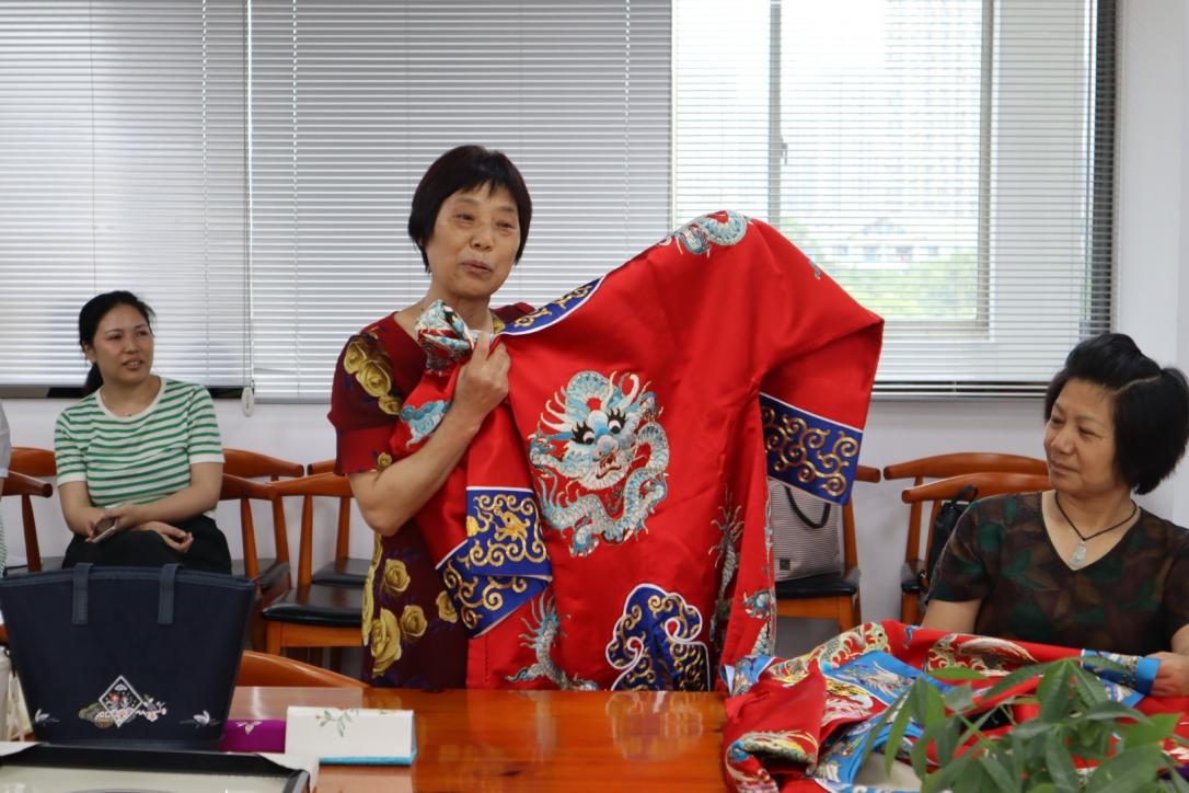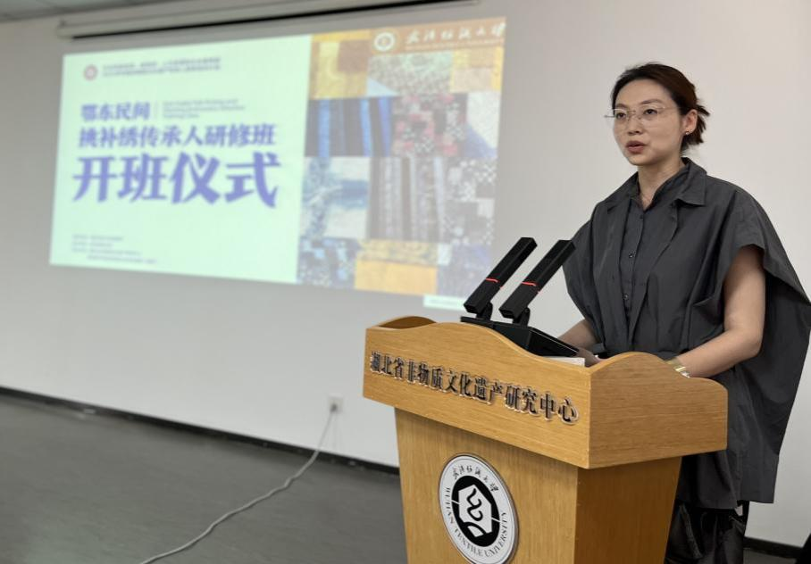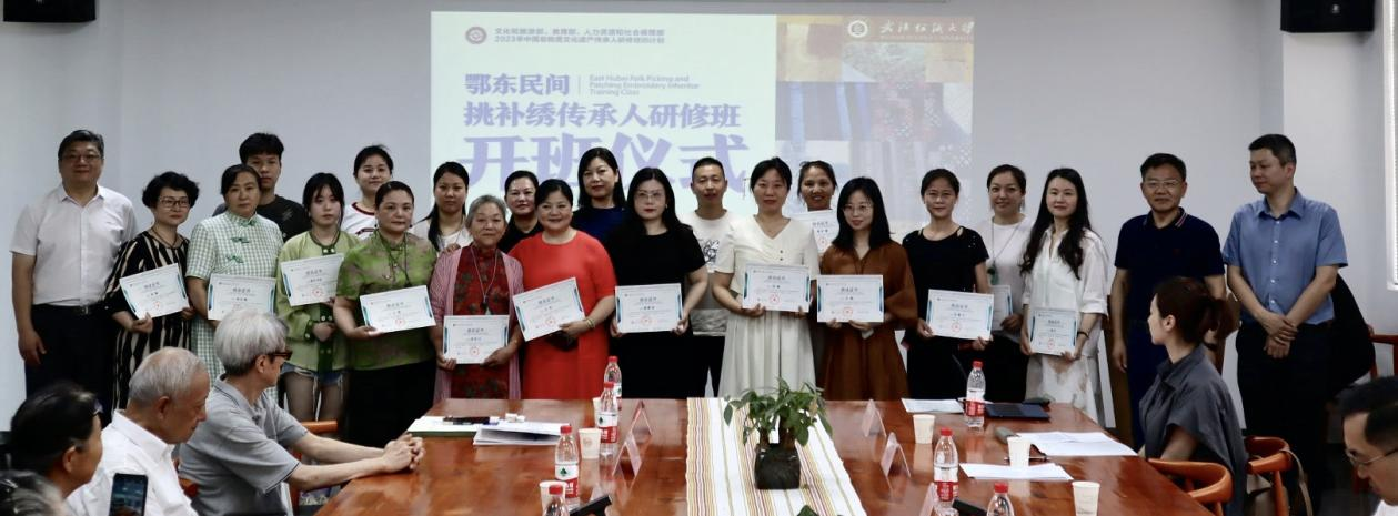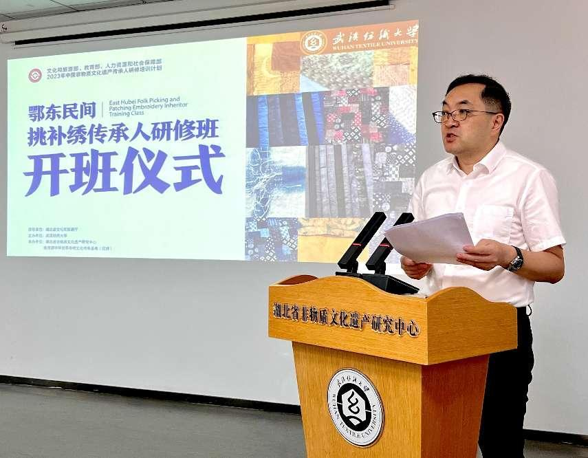 党委书记杜新年、资产处处长赵金龙、科学技术发展院副院长彭张冲等领导,黄梅挑花国家级代表性传承人石九梅、红安绣活国家级代表性传承人刘寿仙等传承人,研培班的全部学员参加了开班仪式,会议由纺大非遗研究中心叶洪光教授主持。