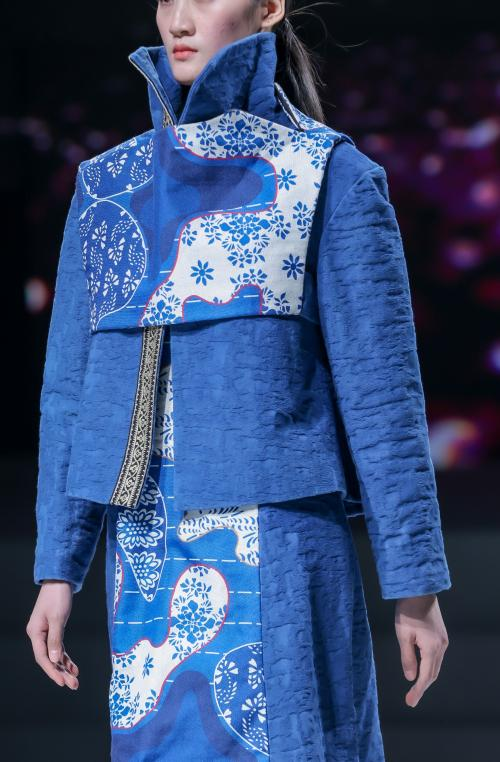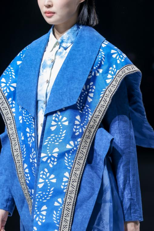 《楚蓝挑韵》非遗服饰系列作品共四套,在楚蓝平染的基础上,运用了省级非遗项目“天门蓝印花布植物纹样复原”的图案设计表现方式,将研究中收集到的现存的天门蓝印花布残缺花版进行虚拟仿真复原工作,通过数字印染的方式还原之前完整的图案纹样。守正创新弥补了手工刻版的缺陷,设计成披肩、上衣和裙装。同时,服装的手工刺绣挑花的边饰,是与中国纺织非遗大使滕静蓉合作完成,恰到好处的二方连续边饰为服装勾勒出清晰的轮廓,充分地诠释出千年蓝染技艺与现代时尚创新设计的完美结合。