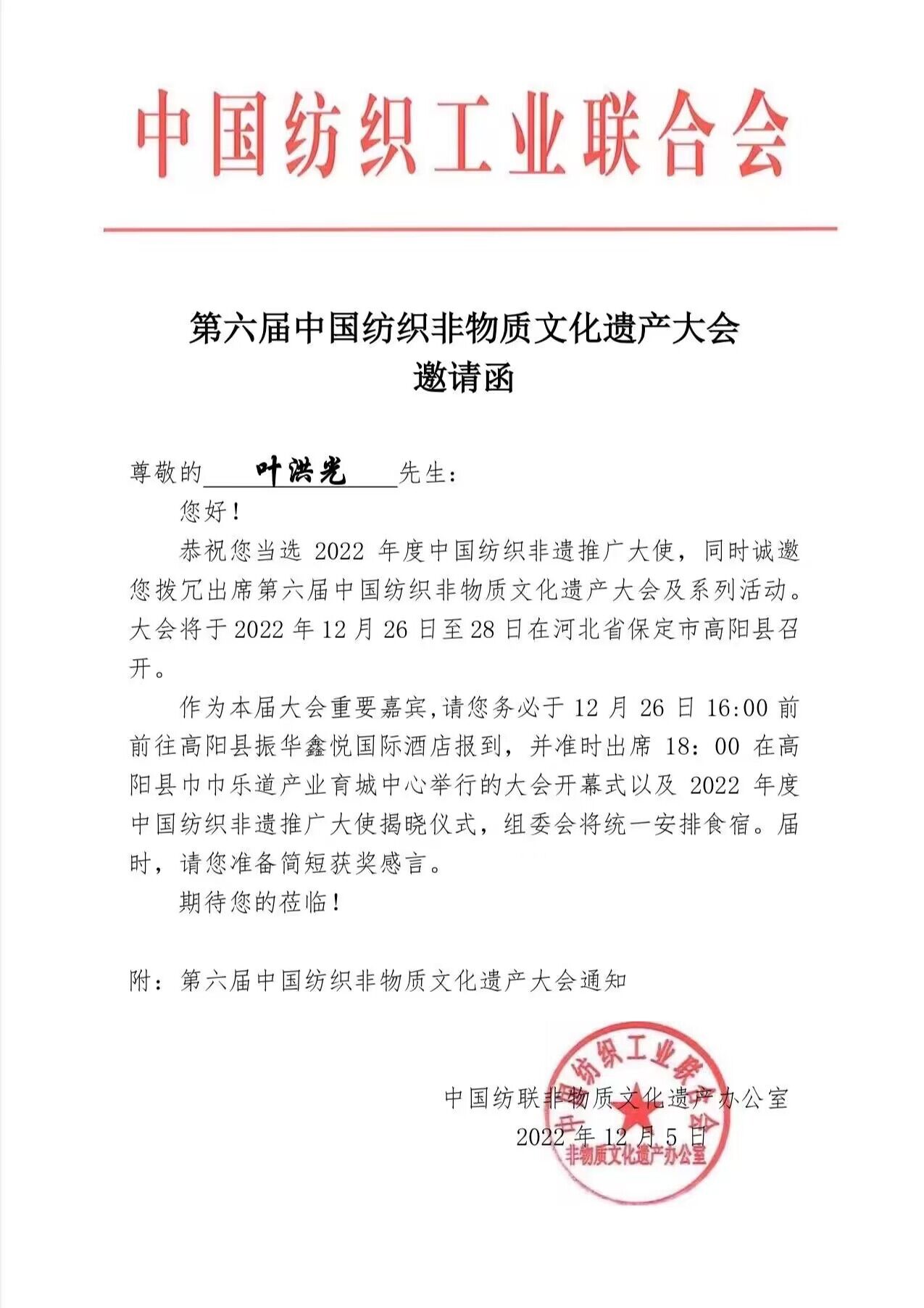 据悉,叶洪光教授已受邀参加12月26日在河北高阳举行的第六届中国纺织非物质文化遗产大会并将在大会上领奖。