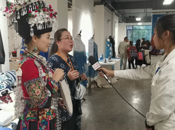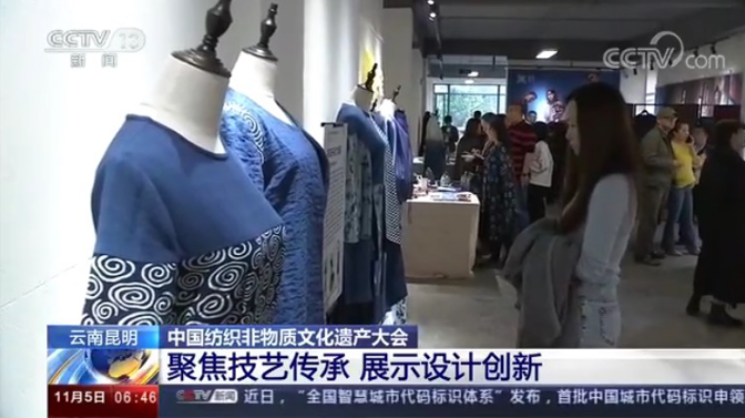 王妮副教授团队获得“首创杯”第三届中国纺织非遗大会文创纪念品创意奖,其植物蓝染服饰作品在会上展示亮相,受到了央视新闻等多家媒体关注和采访。