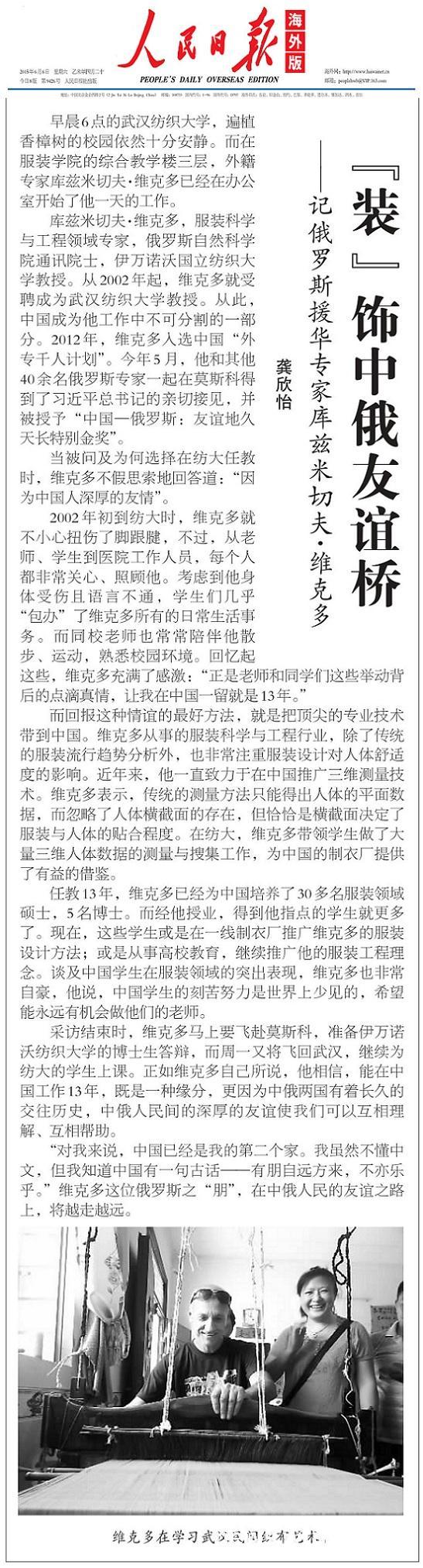 采访结束时,维克多马上要飞赴莫斯科,准备伊万诺沃纺织大学的博士生答辩,而周一又将飞回武汉,继续为纺大的学生上课。正如维克多自己所说,他相信,能在中国工作13年,既是一种缘分,更因为中俄两国有着长久的交往历史,中俄人民间的深厚的友谊使我们可以互相理解、互相帮助。