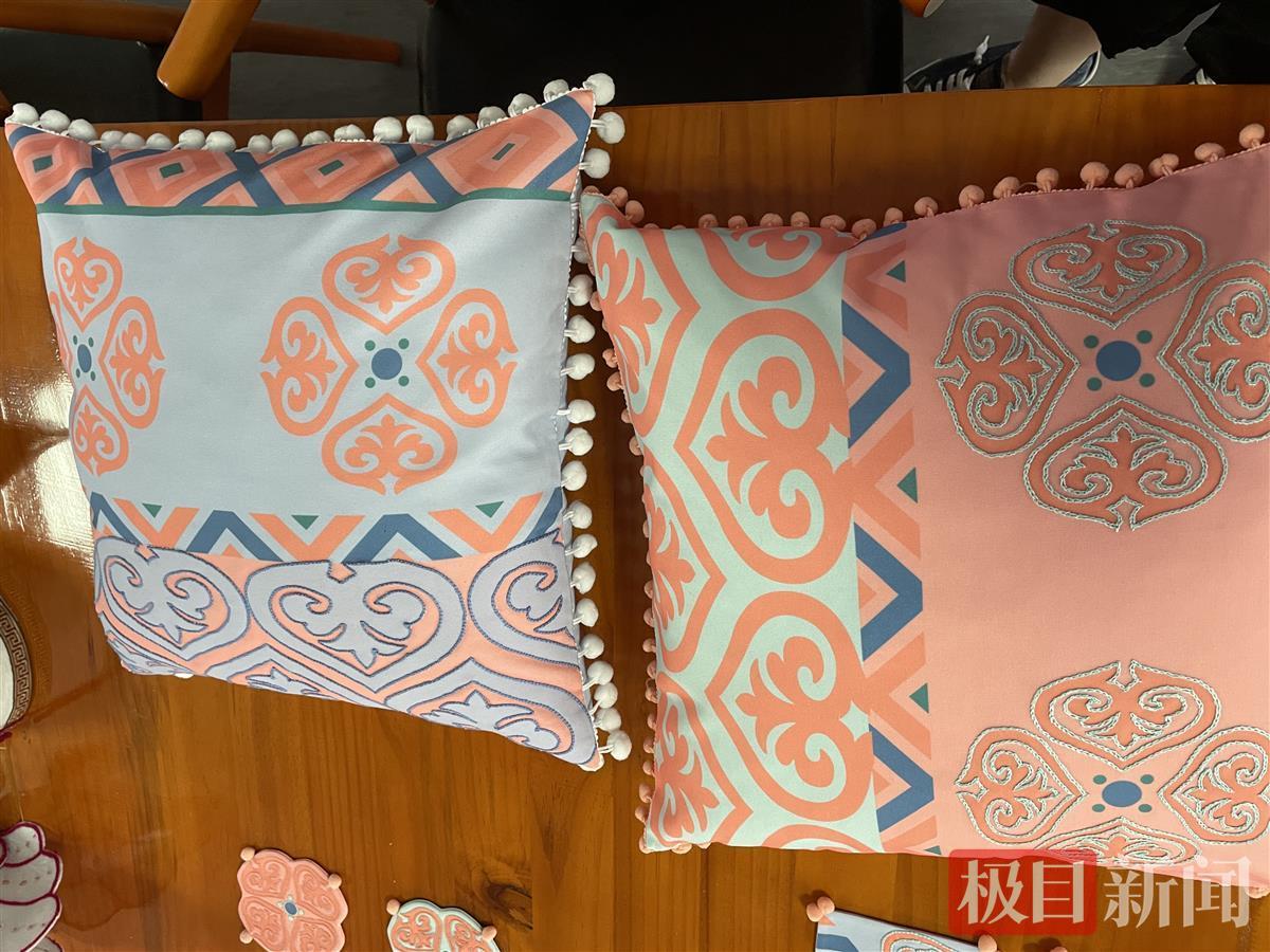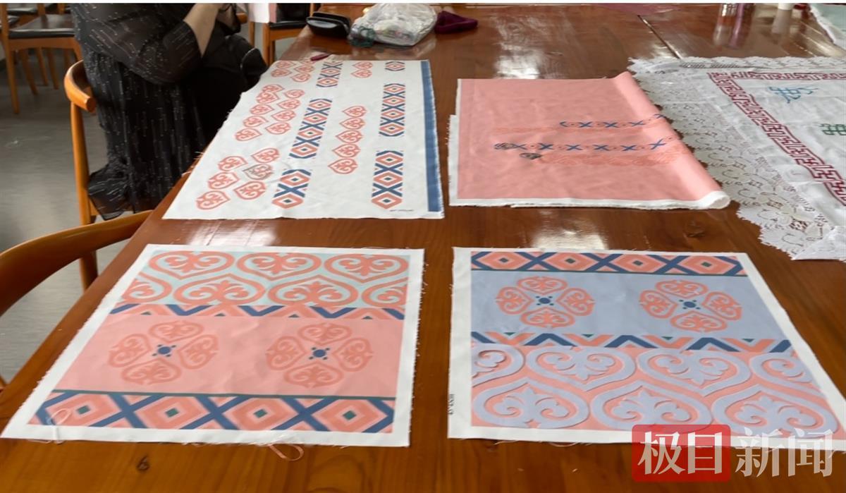 记者在汉绣基地的工作台上看到了这两组刺绣作品,一组是4位绣娘从博州带来的传统作品,一组则是经由百合小说