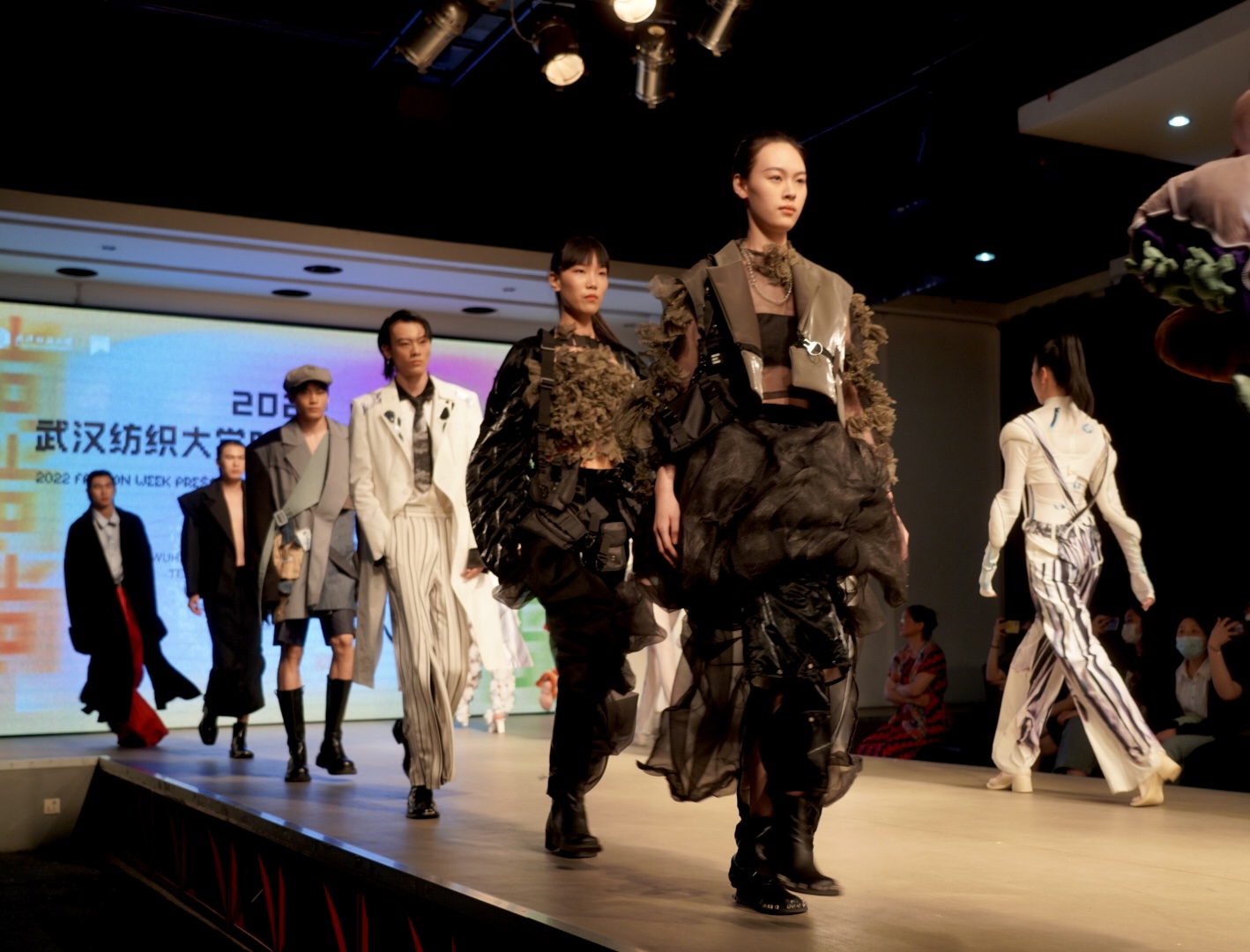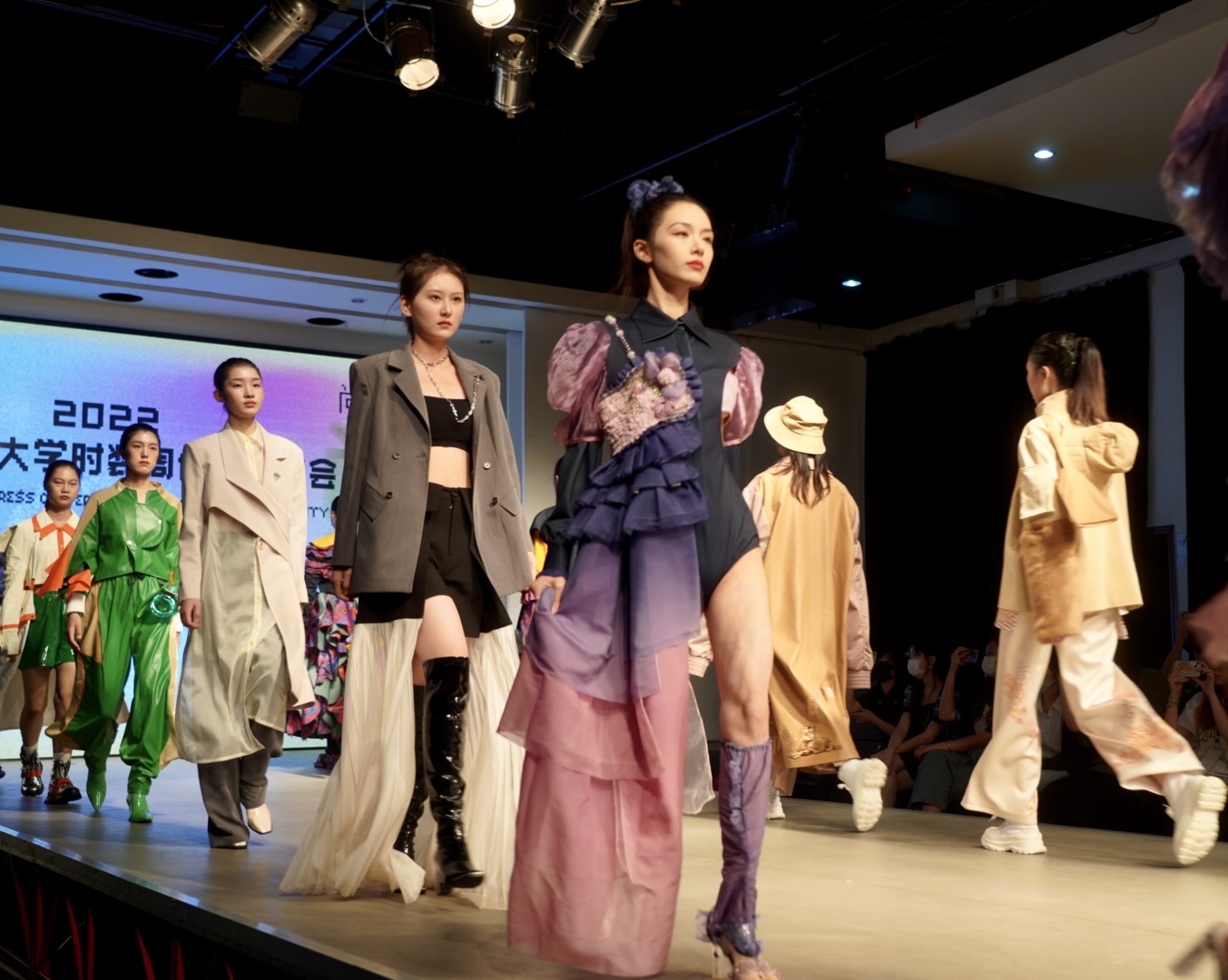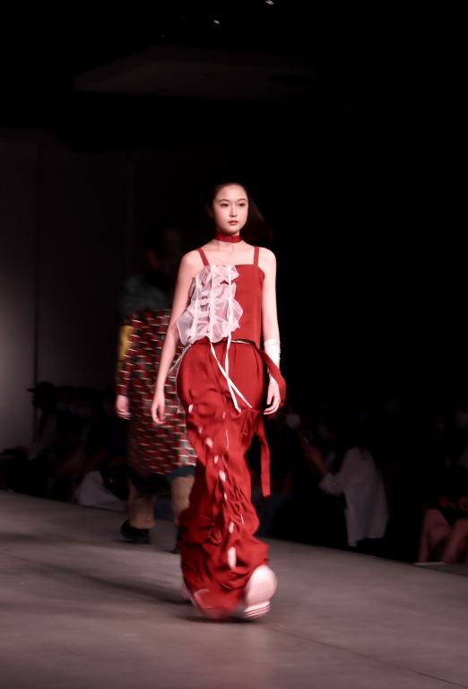 此次的闭幕大秀,是在全院2022届毕业生作品中优选32个系列共82套作品,作品延续服装学院的教学优势与特色,立足创意成衣,在“尚+”设计主题和可持续理念下,从风格、造型、面料、色彩、情感、科技、生活方式等多个维度出发,融合时尚与可持续,展现服装学子的创意思维和独特个性,诠释设计师们对可持续设计理念的理解。