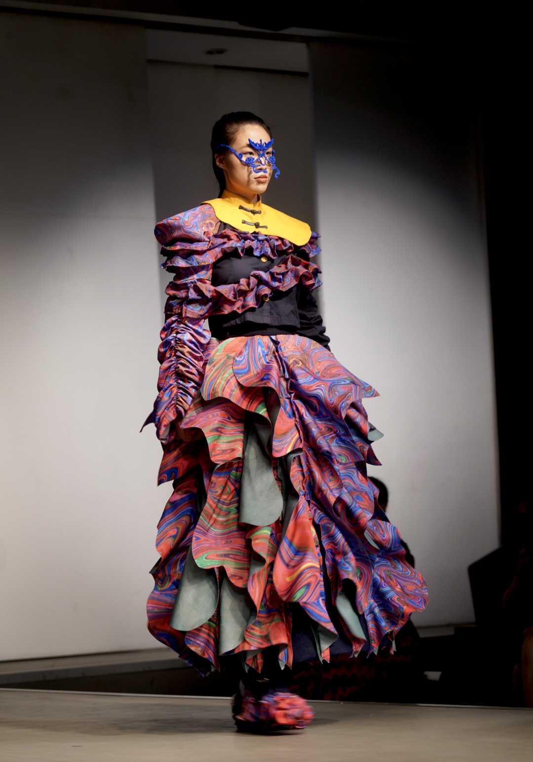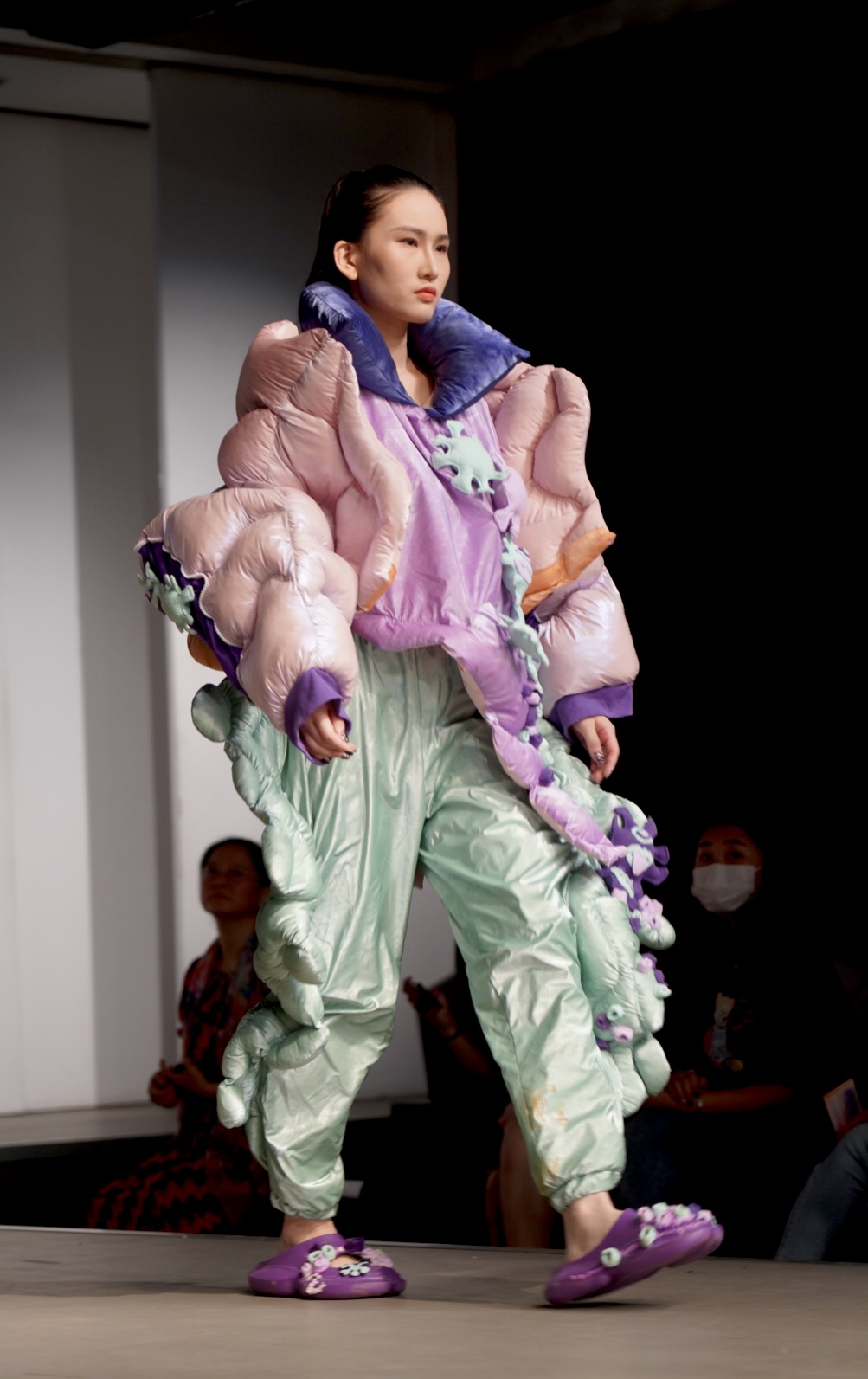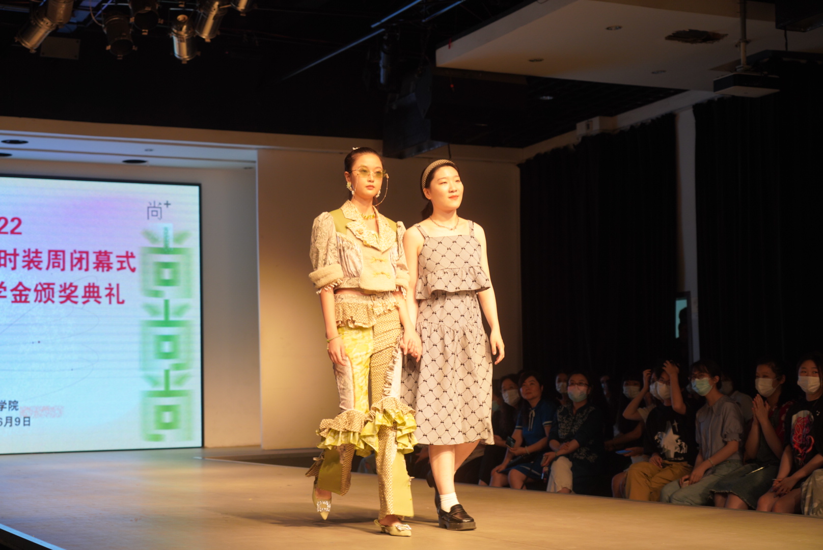此次的闭幕大秀,是在全院2022届毕业生作品中优选32个系列共82套作品,作品延续服装学院的教学优势与特色,立足创意成衣,在“尚+”设计主题和可持续理念下,从风格、造型、面料、色彩、情感、科技、生活方式等多个维度出发,融合时尚与可持续,展现服装学子的创意思维和独特个性,诠释设计师们对可持续设计理念的理解。