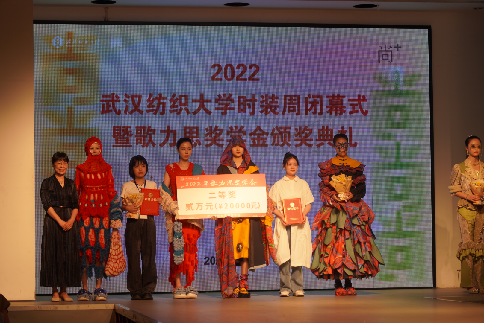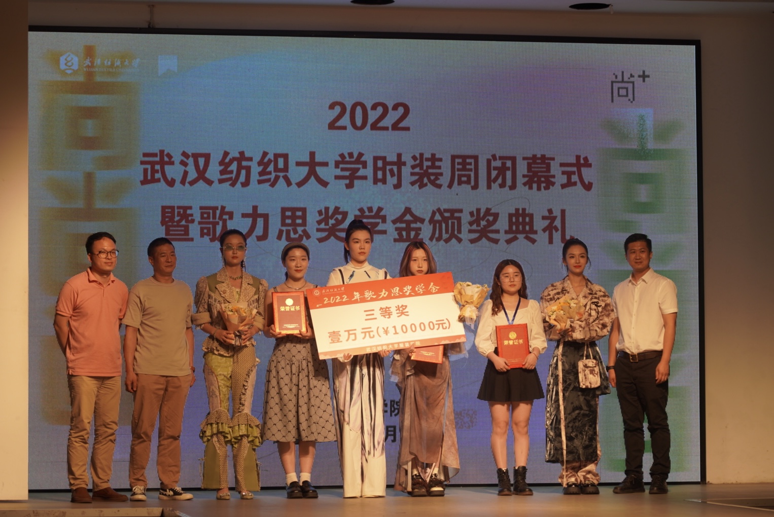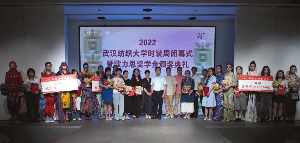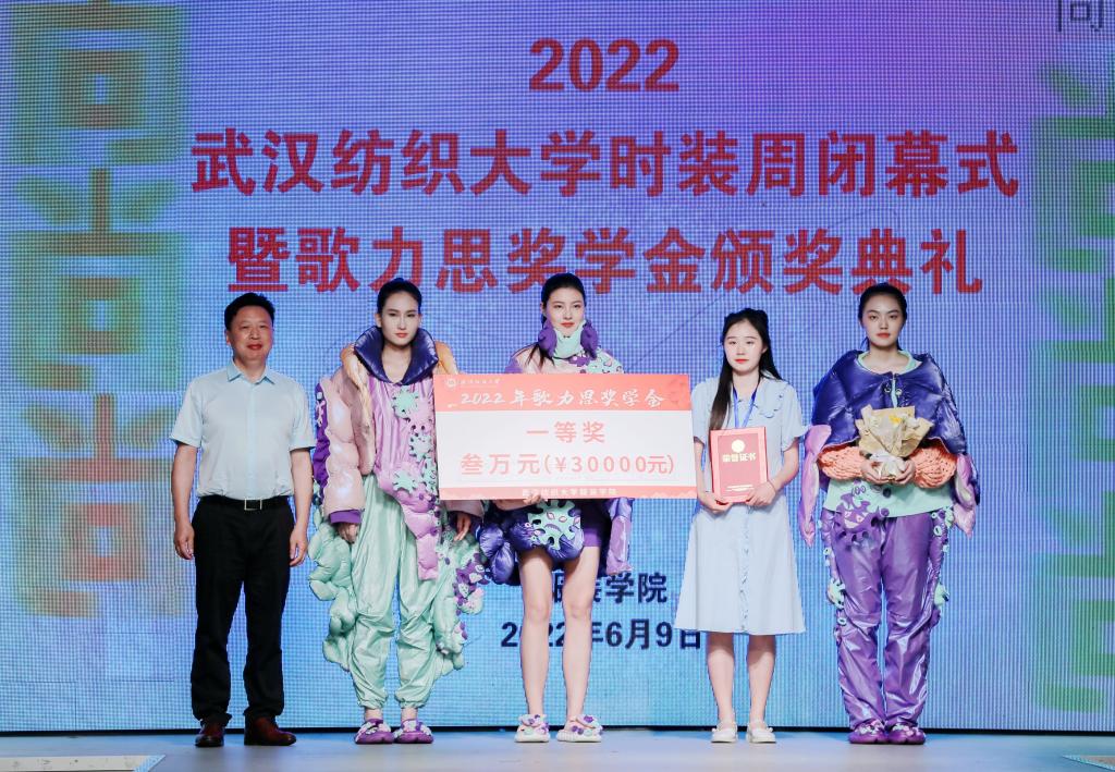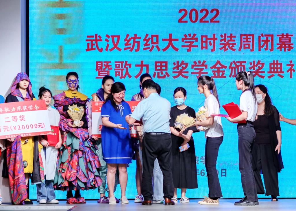 在“歌力思”奖学金颁奖仪式上,深圳歌力思服饰股份有限公司品牌总监王笃森先生发来祝贺的视频,对获奖师生表示祝贺,希望歌力思与纺大建立长远且深厚的友谊,共同为时尚产业培养更多的中坚力量。今年共评选出六位设计师的作品获得歌力思奖学金,现场领导分别为获奖师生代表颁发奖牌和奖金。